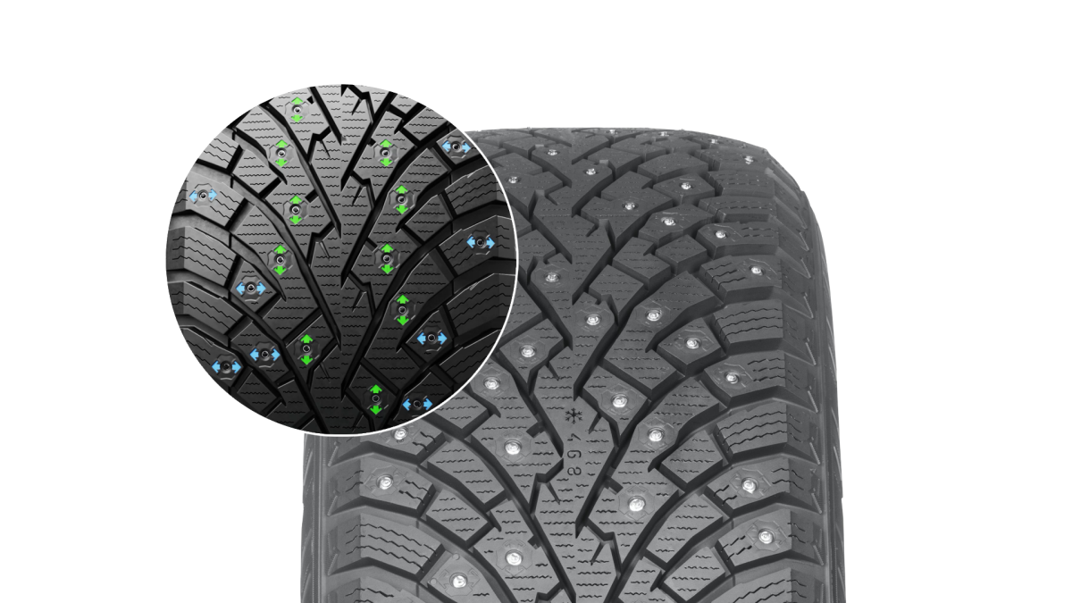 - Tvær gerðir nagla (Double Stud Technology): miðju-naglar fyrir hröðun og hemlun og axlar-naglar fyrir grip í beygjum og akreinaskiptum