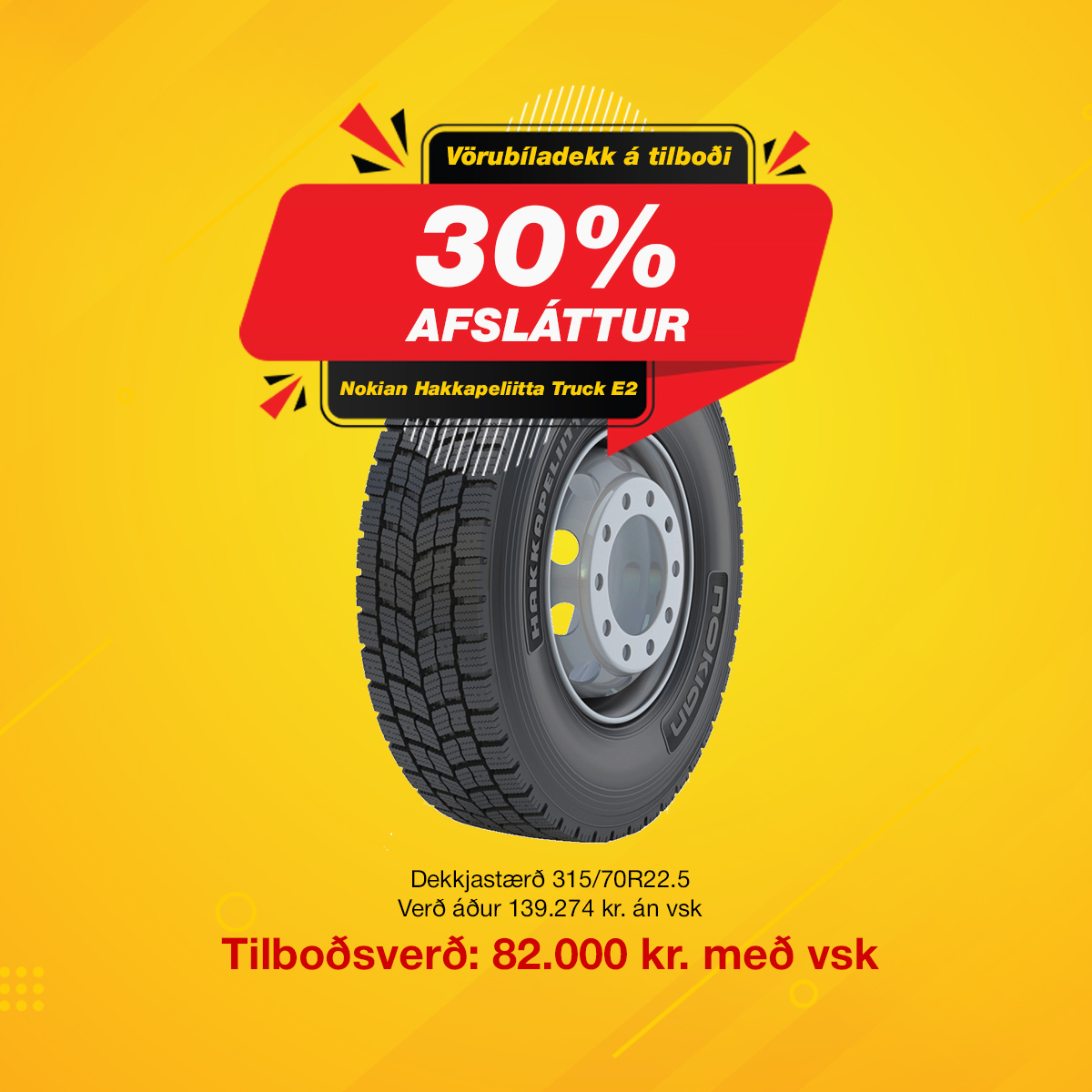Nánari lýsing: Vetrardekkið Nokian Hakkapeliitta Truck E er sérstaklega hannað fyrir driföxla vörubíla með frábært grip, nákvæmt, hljóðlátt og endingargott fyrir krefjandi vetraraðstæður. Það er afrakstur langrar reynslu Nokian við þróun á bestu vetrardekkjum heims. Nokian Hakkapeliitta Truck E er hannað fyrir flutninga á snjóþungum vegum enda framleitt til þess að bregðast við síbreytilegum akstursaðstæðum, allt frá blautu malbiki til snjós og hálku.